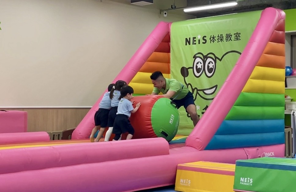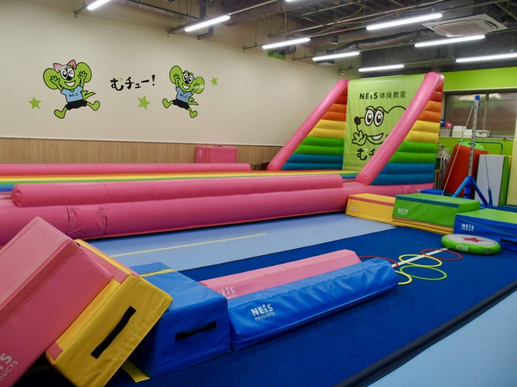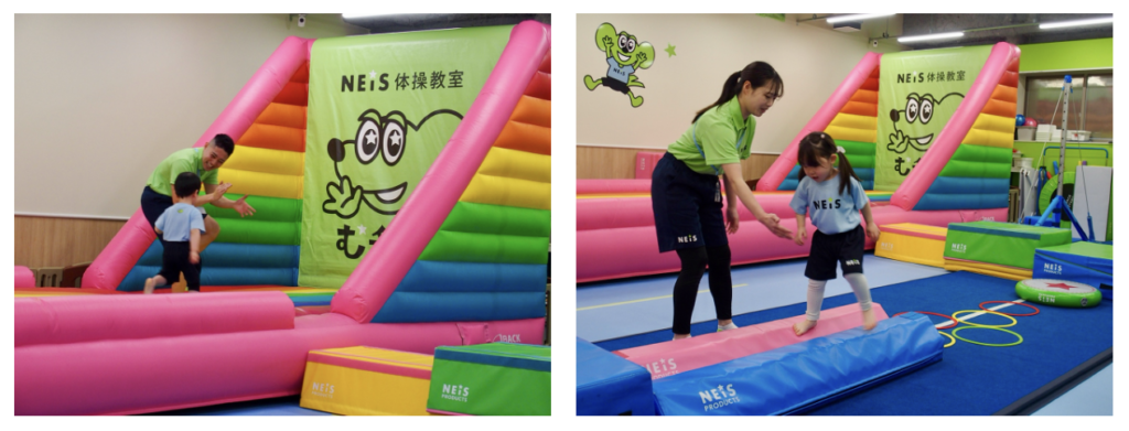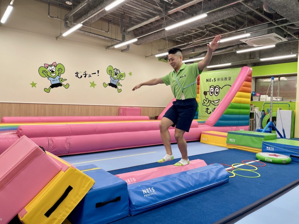 ネイスの強みは、独自開発のオリジナル器具にもあります。ネイスプロダクツ事業も展開しており、教室の95%の器具は自社開発製造。虹色の大型トランポリンなど、子どもが“思わずやりたくなる”設計が特徴です。