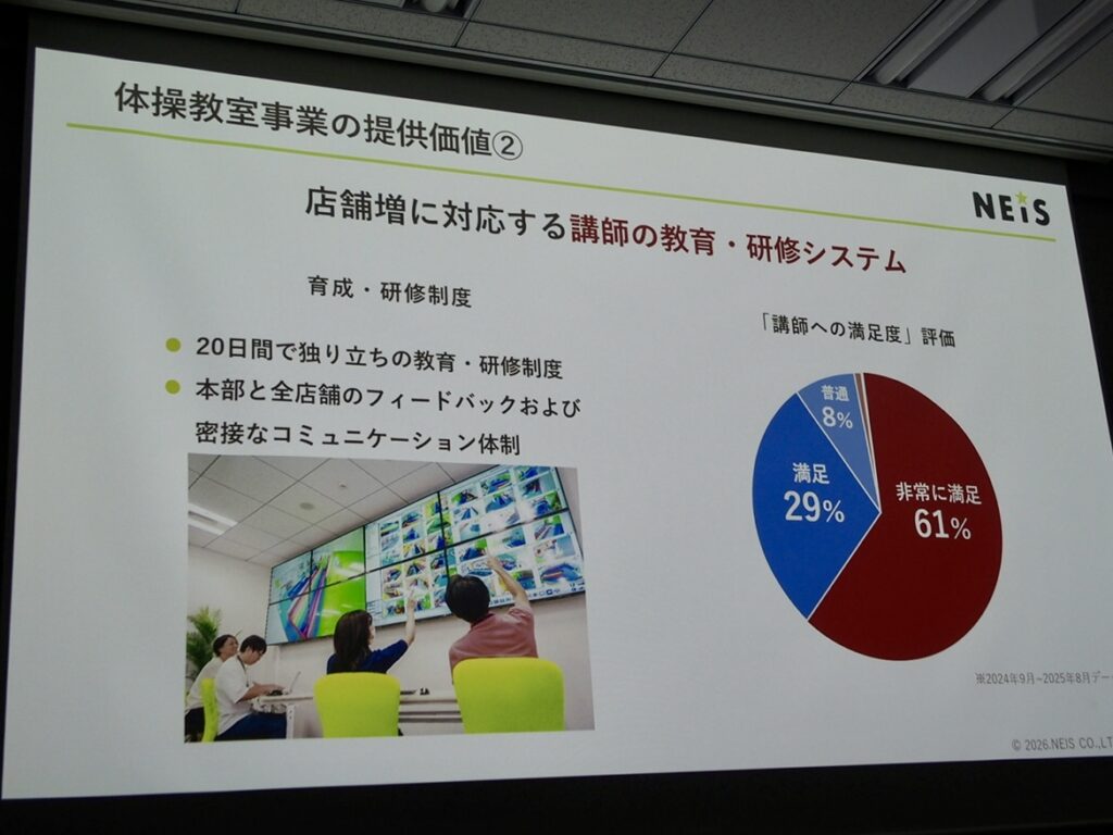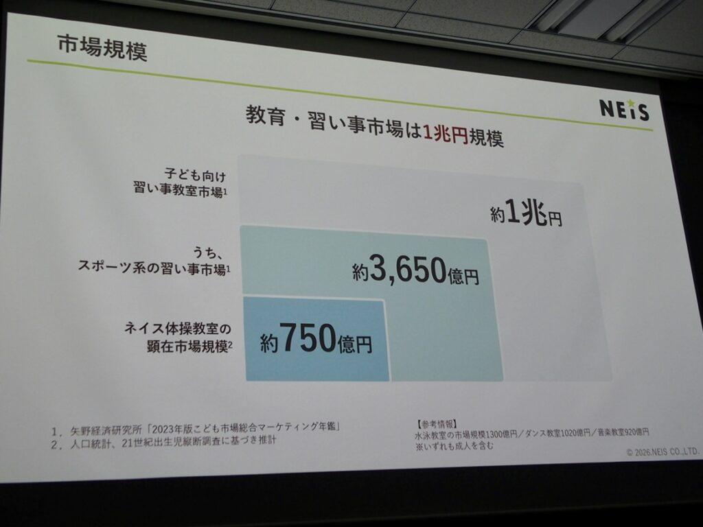 体操教室単体の市場規模は約750億円。しかし、子どもの運動系習い事全体では約3,650億円、さらに教育・習い事全体では1兆円規模といわれています。少子化が進む日本ですが、体操教室の拠点数不足は依然として大きく、さらなる拡大が見込めるそうです。同社は将来的に国内500店舗以上を目指す構想を掲げています。加えて、運動領域にとどまらない中高生向け「ソーシャルスキル塾」の事業開発も進めています。