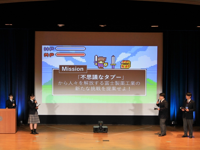 また、小林学園本庄東高等学校「16年目の勇者」は、「『不思議なタブー』から人々を解放する富士製薬工業の新たな挑戦を提案せよ!」のミッションに対し、難易度の高さを思わせる「女性の生理」に着目。クエストゲーム画面を用いたアイデアで立ち向かいました。