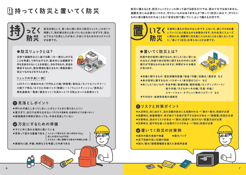 冊子では、こうした「置いてく防災」を実践する方法として、耐火・耐水性能を備えた保管方法などについても紹介されている。