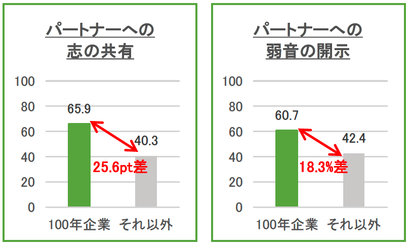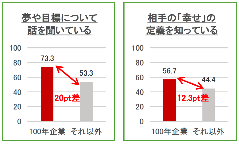 また、100年企業の経営者や社員のパートナーは、相手の夢や幸せをきちんと理解しているという割合が高く、夢や目標について話を聞いているというパートナーは7割を超えていたのだとか。