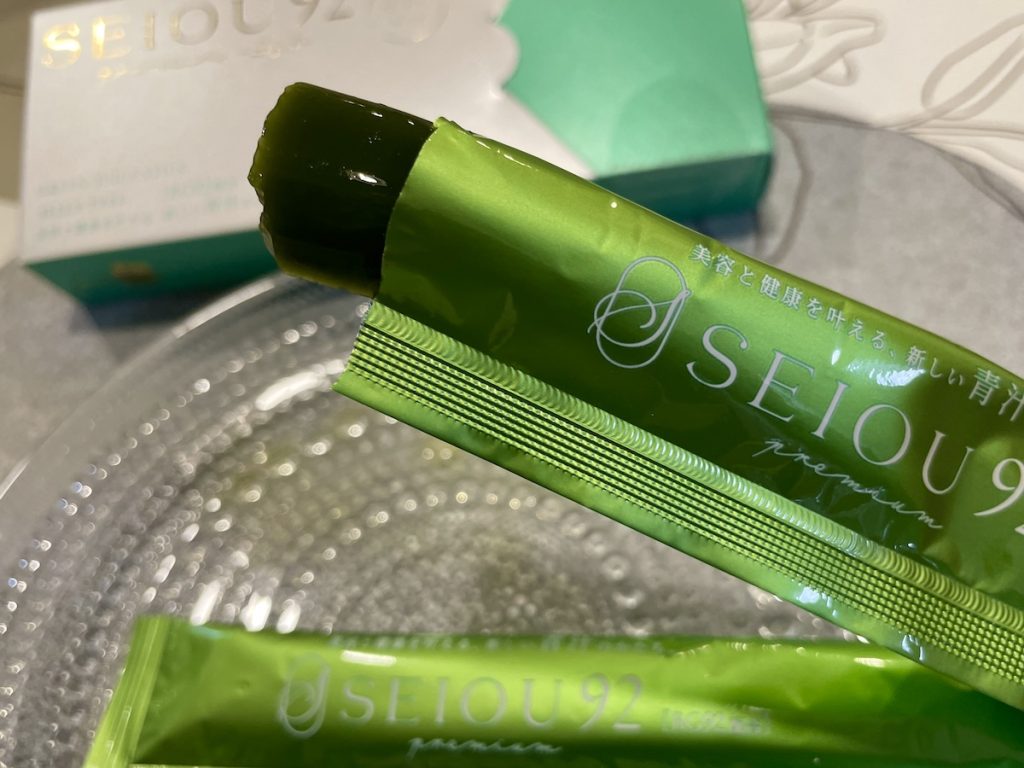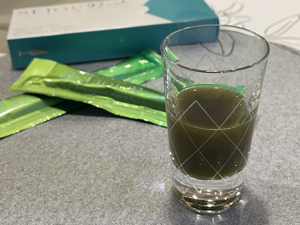 『SEIOU92 プレミアムドリンク』は、見た目は青汁のような、抹茶のような濁った緑色。香りは少し青っぽさもある。袋の開け口が小さいのでそのまま飲むこともできそうだが、一旦ショットグラスに出してみた。