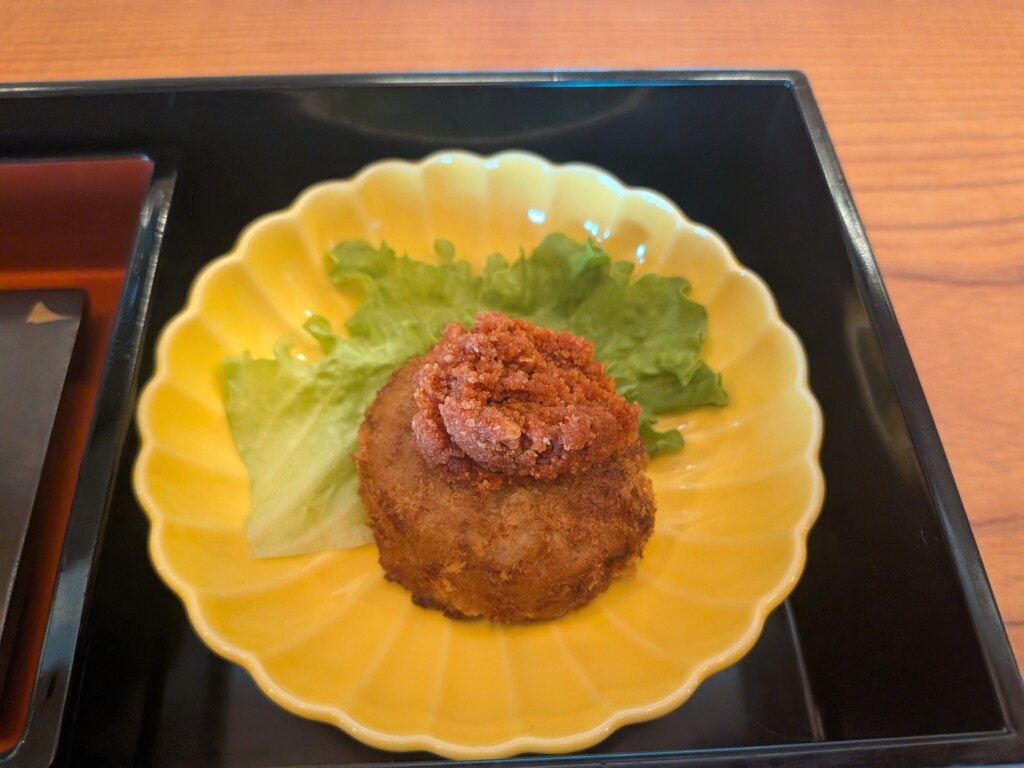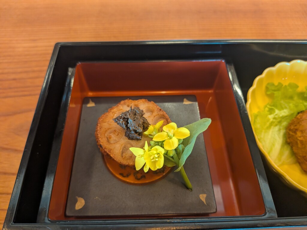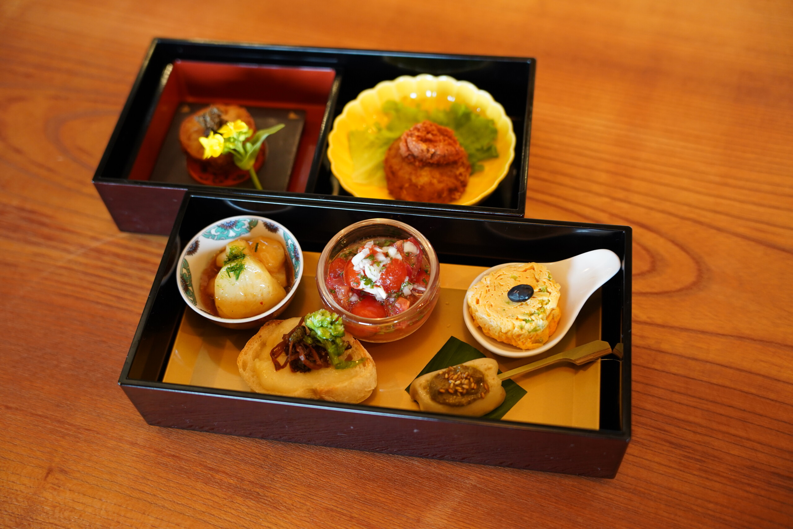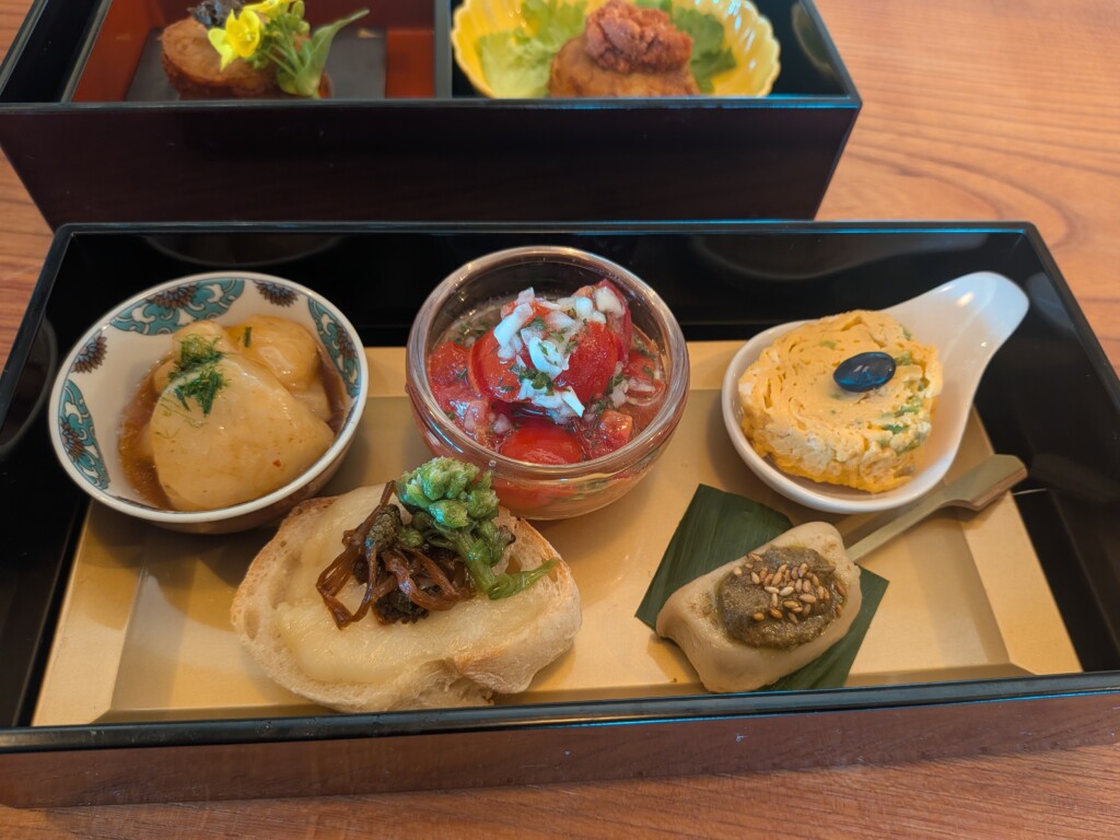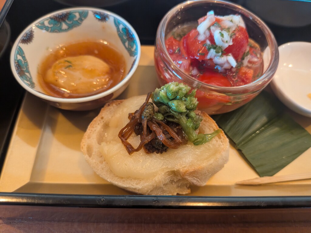 前菜7品 スパイシーコロッケ、生麩のふきのとうジェノベーゼ、自家製長ネギ入りだしまき卵、菊芋の甘酢あん、フルーツトマトと新玉ネギのマリネ、ブルスケッタ ラクレットチーズ つくし煮のせ、レンコンボール 醤油かすのせ