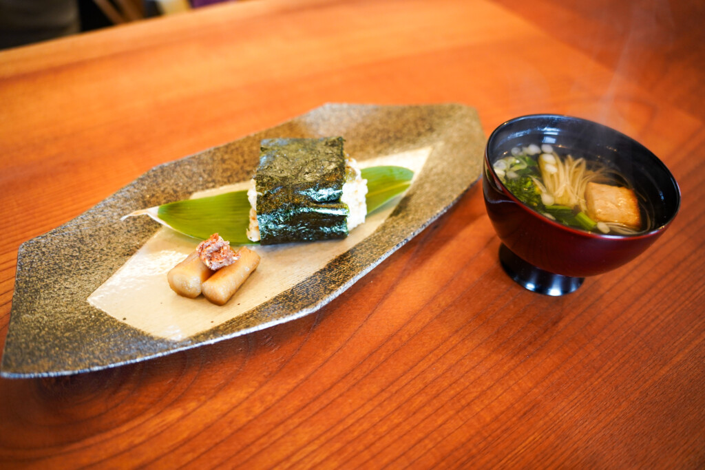 椀・ごはん 鯛のすまし汁 玄米もち入り、玄米むすび&焼魚 or ふき味噌