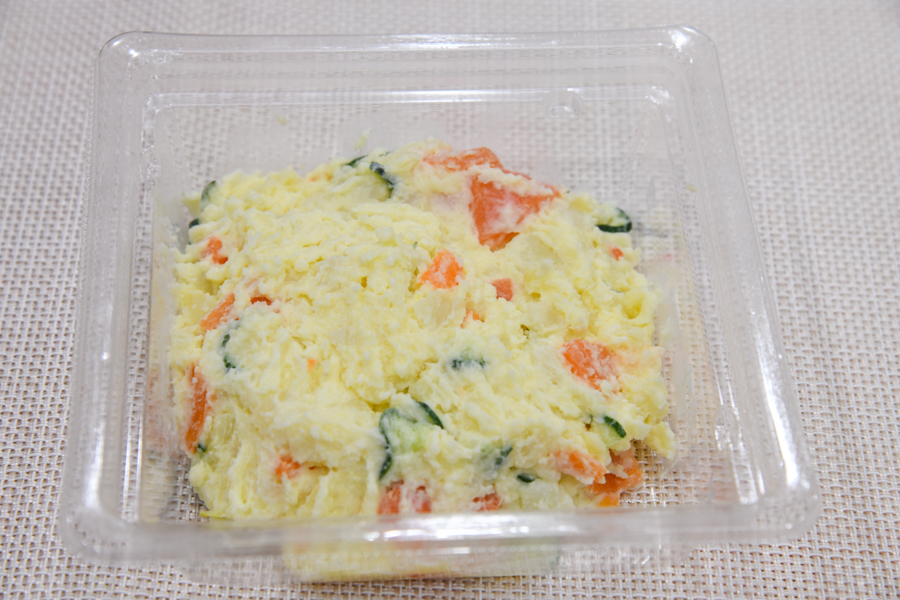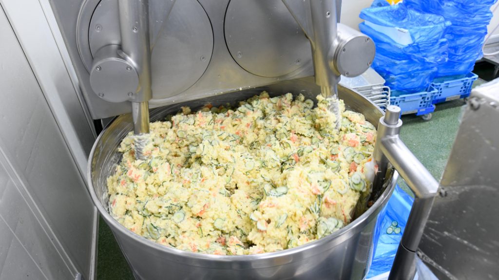 続いて、皮むきを終えサラダ室に運ばれたじゃがいもが、他の材料と一緒にポテトサラダに変わる工程も拝見した。