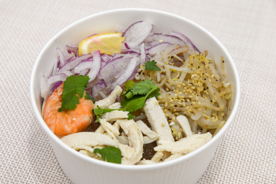 パクチー、蒸し鶏、海老、赤玉ねぎ、もやしがのった華やかな見た目も特長で、ここではまさに麺の上に彩りが添えられていく作業が展開されていた。