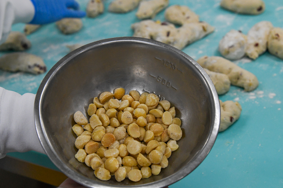 本来ベーグルは焼く前に茹でる作業が必要だが、同社では設備的にその工程を入れるのが難しい中、湯種生地に米粉を入れて、もっちりとした生地を作ることで商品化にこぎつけたそう。「湯種生地に米粉を入れることで外はカリっと中はモチっとした食感を実現しています」と素材について語った積田さんは、食感を残すため練りの工程の最後に加えるという大粒のマカダミアナッツも見せてくれた。