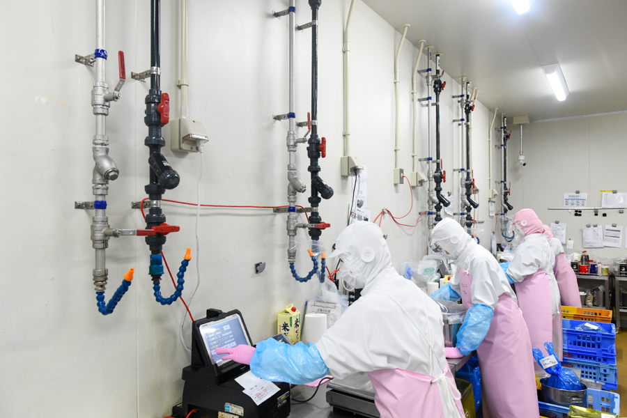 この部屋にはなんと200種類近い調味料がストックされているそうで、それらを駆使して毎日の製造に使う調味料を調合している。特に使う量が多い濃口醤油と油は、計量器ごとに設けられた2本のノズルから出てくる仕組みだ。