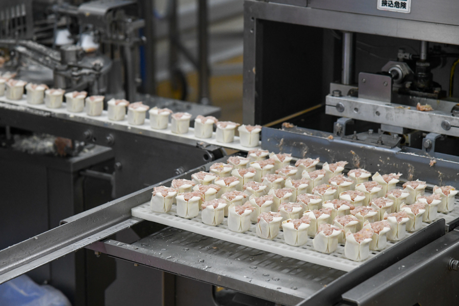 見学の終盤、成形室では『国産豚のジューシー焼売(小)』の製造を拝見。本商品は冷凍していないフレッシュな豚肉のたねに帆立の干し貝柱、干し椎茸、クラッシュした干し海老をペースト状にして入れることで深い旨みに仕上げた大橋さん渾身の一品だ。ここまで見てきたこだわり同様、こちらもやはり皮から自家製で、具が盛り上がるように綺麗に成形された立派な焼売が無数に並ぶさまは、一種のアート的なものを見ているかのような様相だった。