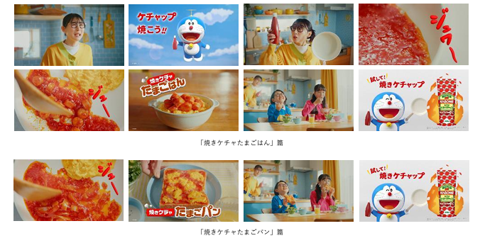 忙しい朝のキッチンで「何を作ろう」と悩む主婦のもとへドラえもんが登場し、新しい調理法を提案。フライパンでトマトケチャップを焼くだけで、味わいが濃厚でコク深く変化し、卵やソーセージなど身近な食材と合わせるだけで簡単かつ満足感のある一皿が完成する。ドラえもんが「ケチャップを焼こう!!」と呼びかけるシーンが印象的であり、楽しくキャッチーなCMに仕上がっている。