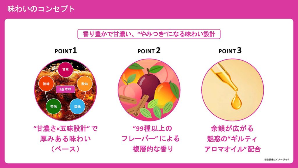 1つ目は、糖度の指標であるBrix値を一般的な炭酸飲料よりも高い13.3に設定し、さらに甘味、酸味、苦味、塩味、旨味の「五味」を複雑に配合した「甘濃さ×五味設計」。2つ目は、完熟フルーツやトロピカルフルーツをベースに、シナモンやカルダモンなどのスパイス、バニラやチョコレート系の香りを隠し味として加えた、99種以上のフレーバーによる「複層的な香り」。そして3つ目が、その独自の香りを閉じ込め、長く余韻を楽しめるように配合された「ギルティ・アロマオイル」だ。