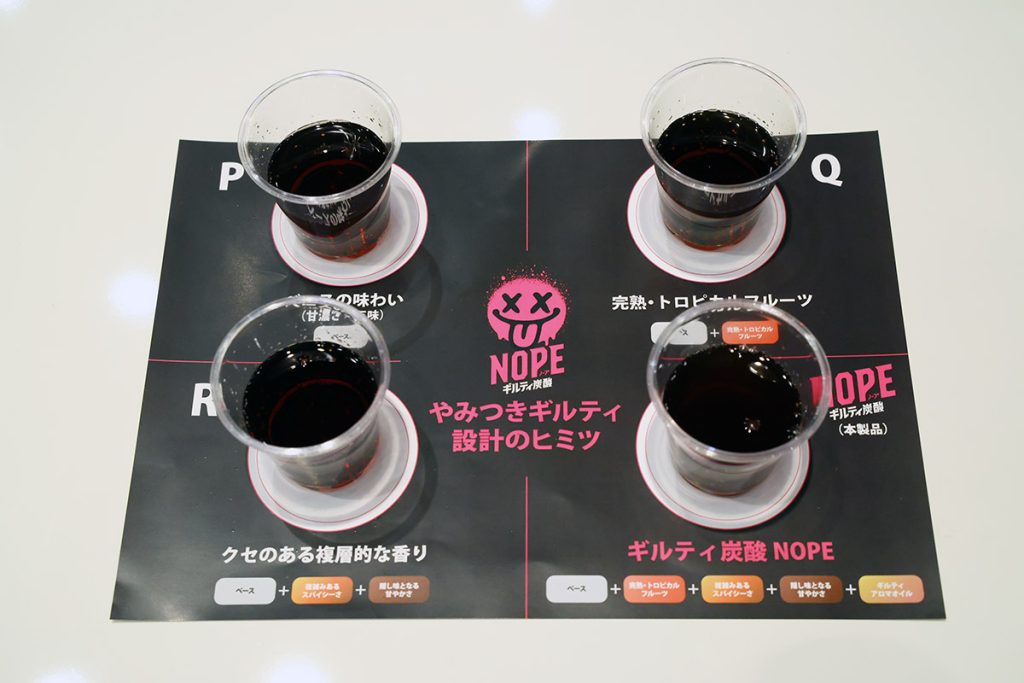 会場では、この複雑な味わいを紐解くための試飲体験も実施された。用意されたのは、ベースの味わいのみのサンプルP、それにフルーツフレーバーを加えたサンプルQ、さらにスパイスやバニラ系の香りを加えたサンプルR、そして全てを統合した完成品「NOPE」の4種類。段階的に飲み比べることで、単なる甘さだけでなく、奥深いスパイスの香りや、後を引く余韻がどのように作られているのかを、来場者は舌で実感した。