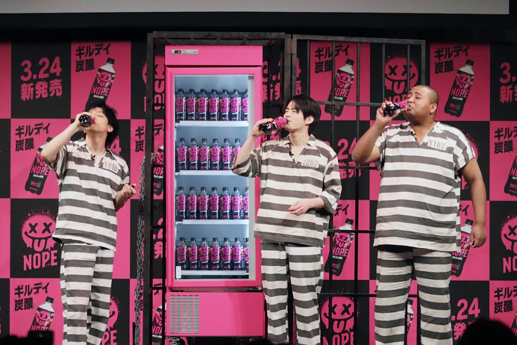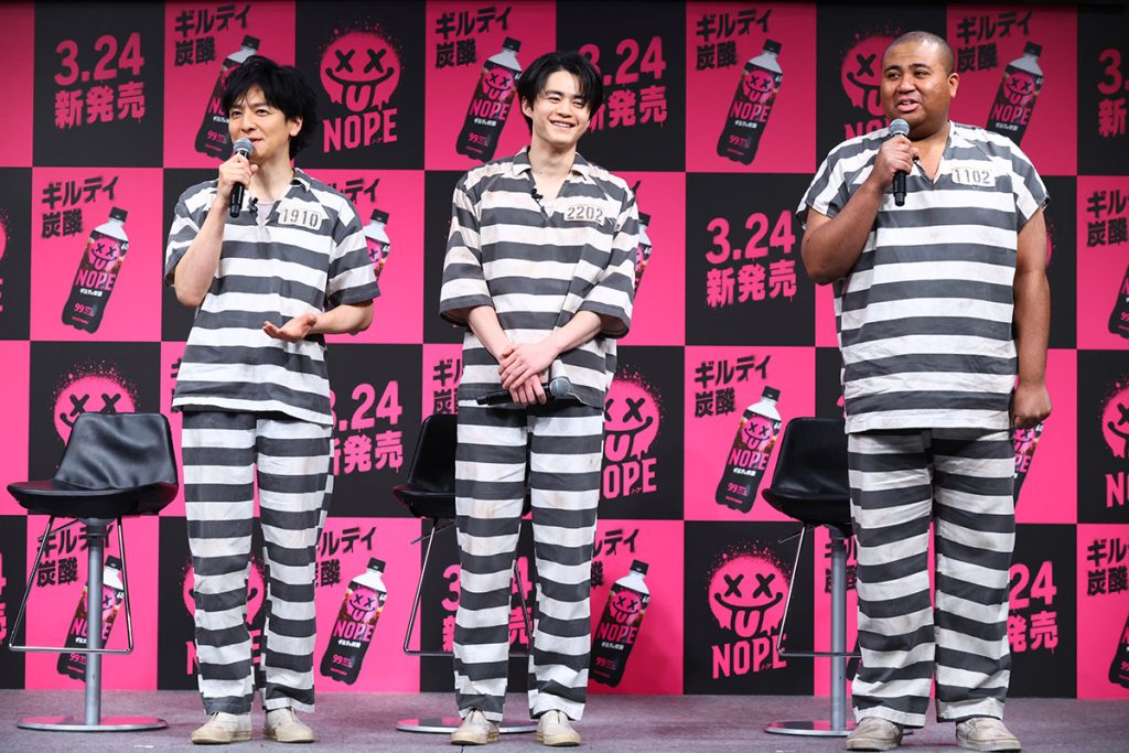 生田斗真、鈴鹿央士、アントニーが囚人服で登場! サントリー約14年ぶりの大型飲料ブランド「ギルティ炭酸 NOPE」発表会開催