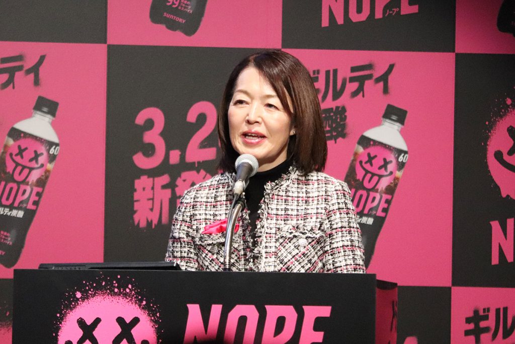 発表会の第一部では、サントリー食品インターナショナル SBFジャパン 常務執行役員の佐藤晃世氏が登壇し、飲料市場における炭酸カテゴリーの現状と今後の戦略を説明した。