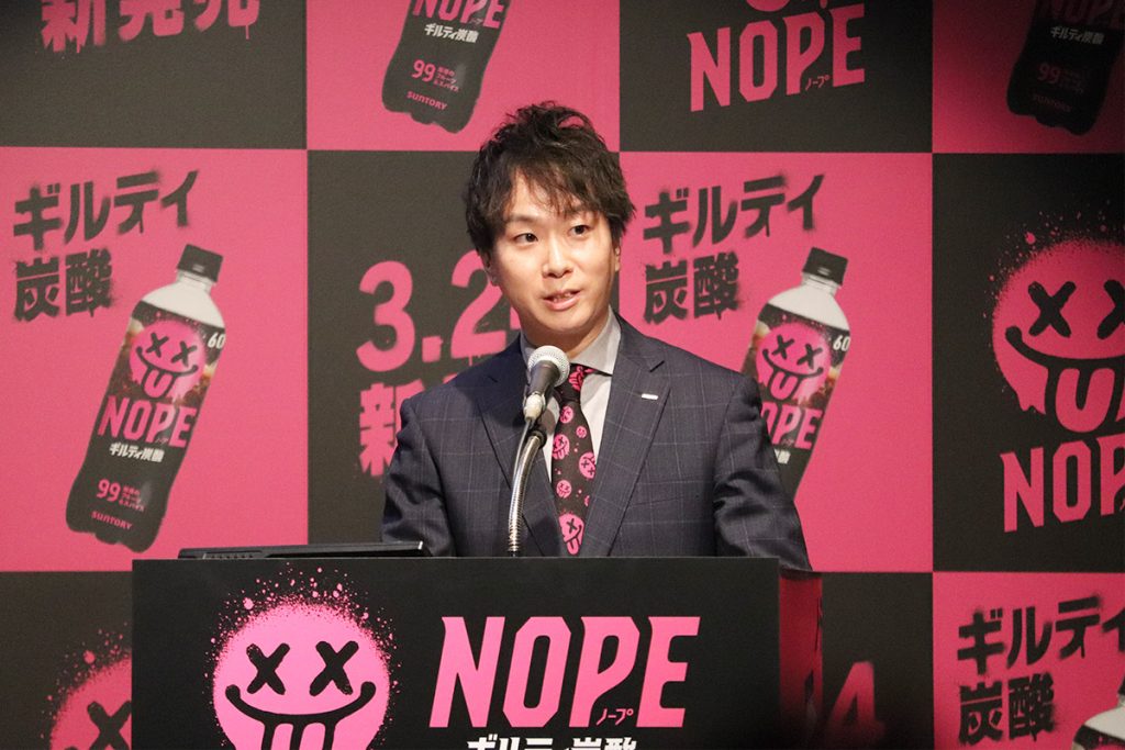 続いて、ブランドマーケティング本部の大槻拓海氏が「ギルティ炭酸 NOPE」の開発背景と商品コンセプトを解説。コロナ禍を経て、現代人のストレス、特に対人ストレスが深刻化している現状に触れ、「普段は我慢していても、時には欲望を解放し、好きなことに没頭することでストレスを解消している」と、背徳感を感じつつもあえて欲望に溺れる“ギルティ消費”のトレンドを解説した。
