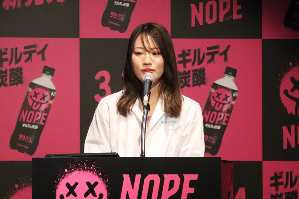 改めて「NOPE」を味わった生田さんは、「罪と背徳と、ついあと1話見ちゃうドラマの味がしました。明日早いのに見ちゃう、あの止まらない感じ」と、そのやみつき感を表現。「油ギッシュな餃子やチャーハンに合わせたい」と語った。鈴鹿さんは「二度寝ならぬ三度寝の味。もっと寝たいという、戻ってこれない沼の味ですね。韓国料理の濃い味と一緒に飲みたい」とコメント。アントニーさんは「大盛り無料の味。大盛りにしない選択肢がないように、これを飲む以外の選択肢がない味です。宅配ピザと合わせたいですね。肉汁、アブラ、ノープ!」と、最高のペアリングを提案し、そのおいしさをアピールした。