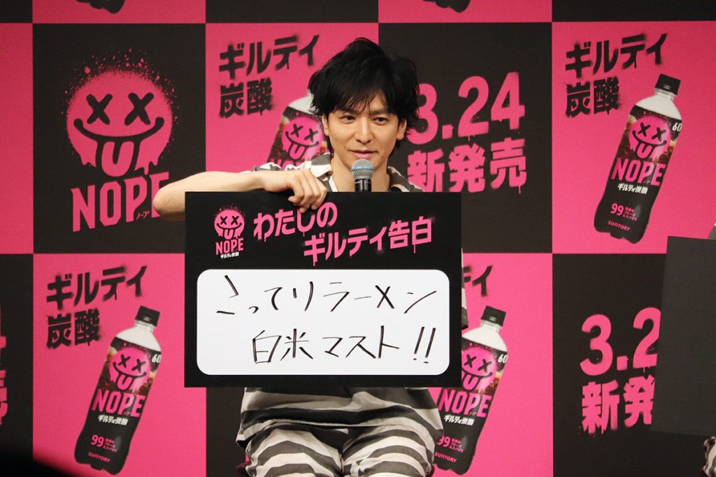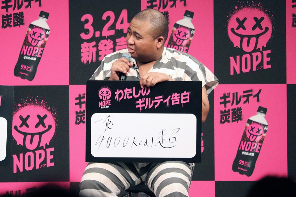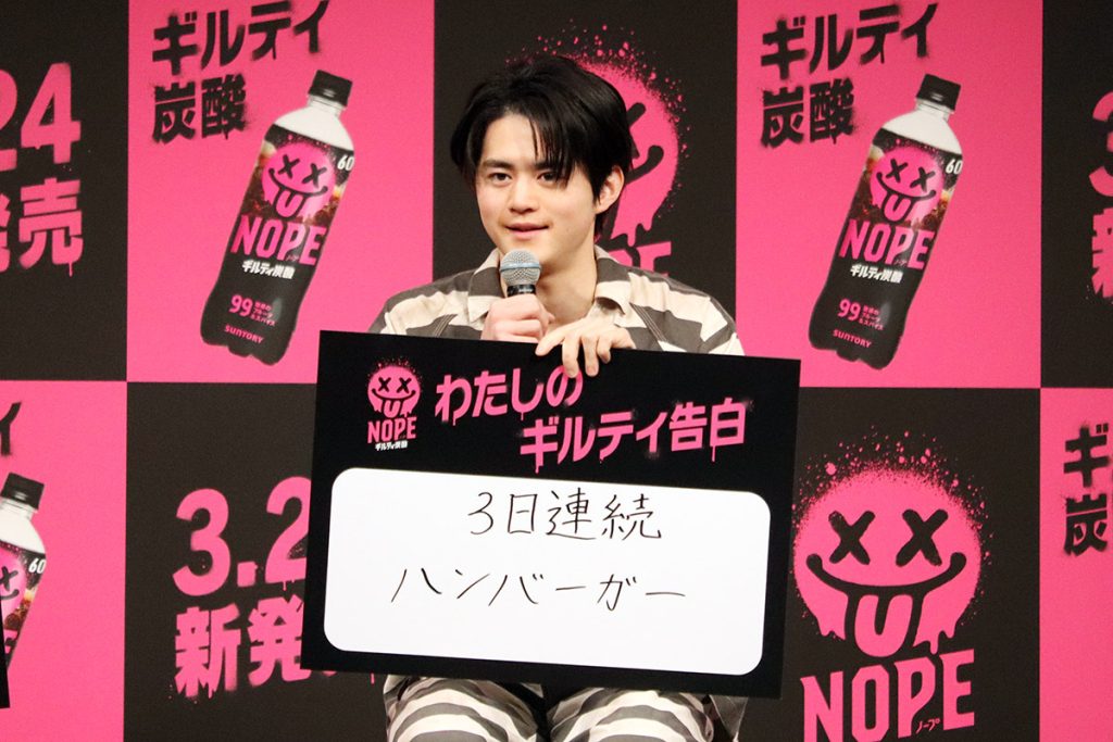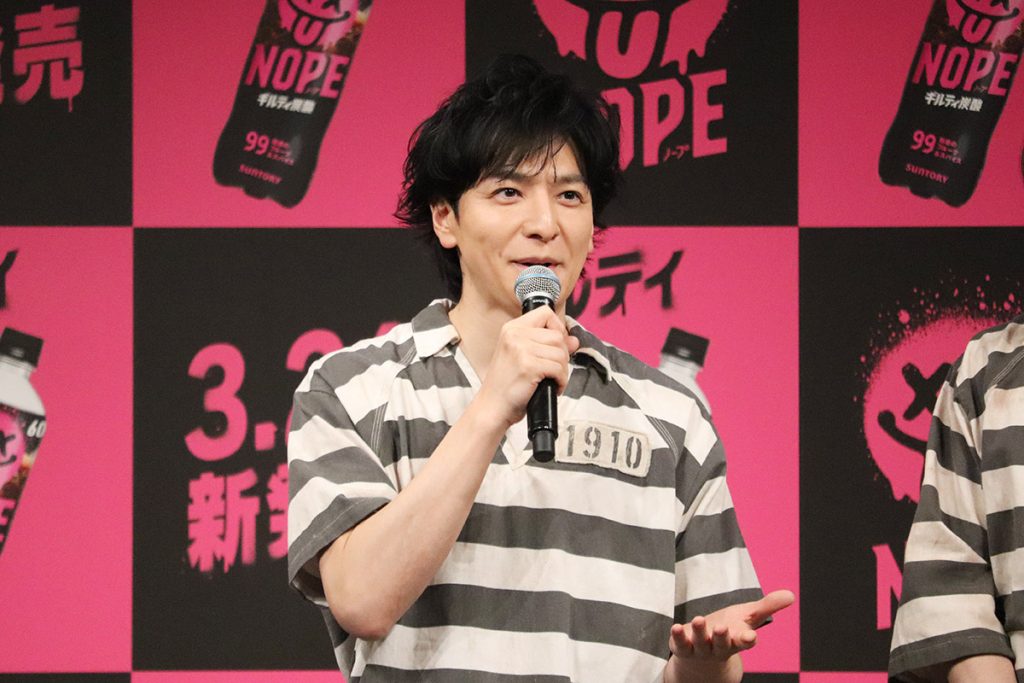 サントリー食品インターナショナル株式会社は、約14年ぶりとなる大型飲料ブランド「ギルティ炭酸 NOPE(ノープ)」を3月24日(火)より全国で発売する。これに先立ち、3月17日(火)に「『ギルティ炭酸 NOPE』戦略説明&新TV-CM発表会」を、都内某所にて開催した。当日は第一部として、「炭酸飲料カテゴリー」の戦略と新商品の開発背景を説明。第二部では、新TV-CM「ギルティ監獄」篇に出演する生田斗真さん、鈴鹿央士さん、お笑いコンビ・マテンロウのアントニーさんが囚人服姿で登場し、CMの裏話や自身の“ギルティ”な体験を語った。