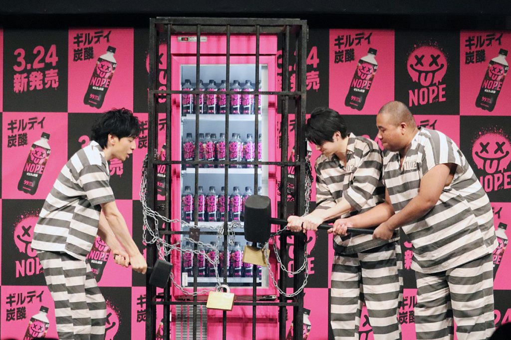 イベント終盤には、ステージ上に巨大な「監獄冷蔵庫」が登場。3人が息を合わせてハンマーで鍵を打ち砕き、中からキンキンに冷えた「NOPE」を取り出した。