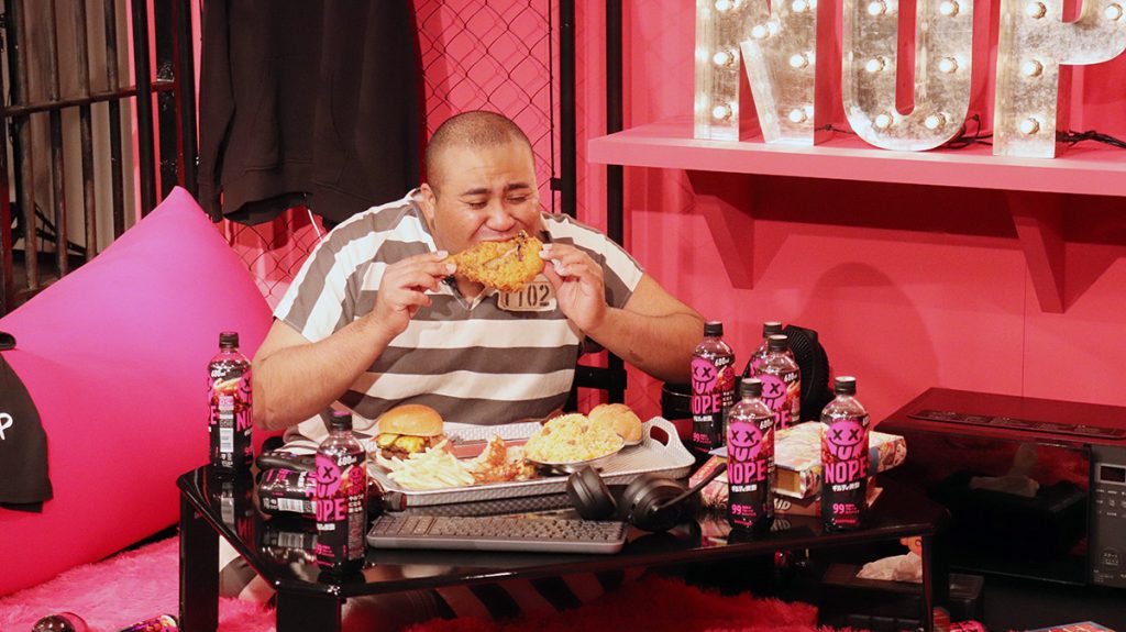 「ワインのペアリングのお店があるように、今年、NOPEとペアリングの『アントニーのギルティ食堂』を出します!」と意気込むアントニーさん。「中華もスイーツもいいけど、やっぱりジャンクなチキンとNOPEが最高ですね」と、最強の組み合わせを見つけ出し、至福の表情を浮かべていた。その後、アントニーさんは「NOPE」のサンプリングイベントに参加するため、名残惜しそうに「ギルティ独房」を後にした。
