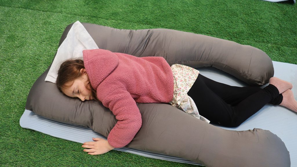 都会の喧騒を忘れさせてくれるような空間で体験できるのは、SNSの口コミやECサイトで爆発的な人気を誇る「ハグモッチ」の寝心地。最大の特徴は、計算し尽くされた独自のフォルム。横になった瞬間、全身をやさしくホールドし、守られているような不思議な感覚に包まれる。