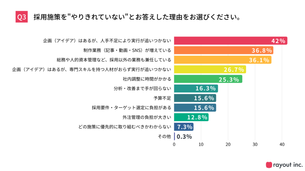 では、なぜ採用施策はやりきれないのでしょうか。最も多く挙げられた理由は、「企画(アイデア)はあるが人手不足により実行が追いつかない」というもので、42.0%にのぼりました。さらに、「記事・動画・SNSなど制作業務の増加」(36.8%)や、「総務や人的資本管理など採用以外の業務との兼務」(36.1%)といった回答も多く見られています。単純な人手不足だけでなく、業務の複雑化や負荷の分散が、実行力を下げている要因といえそうです。