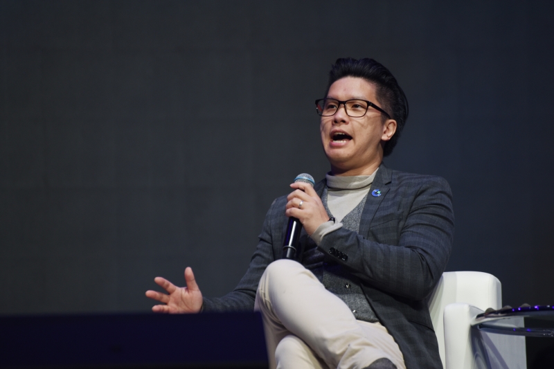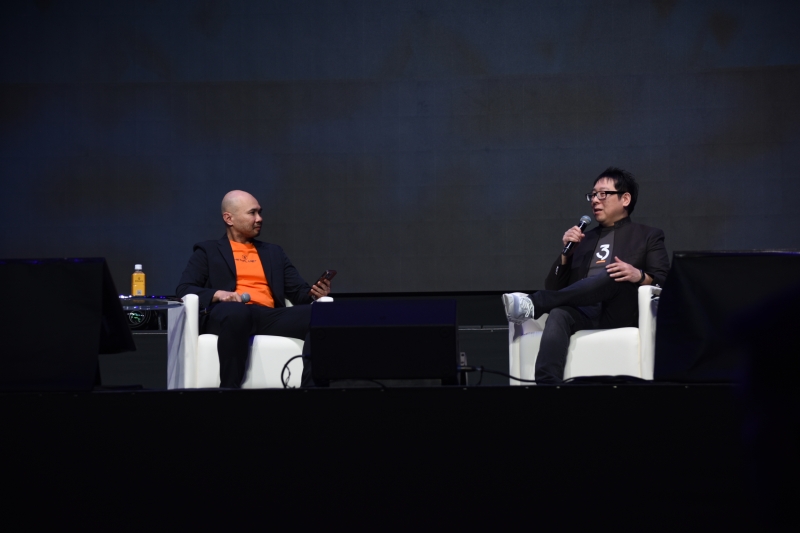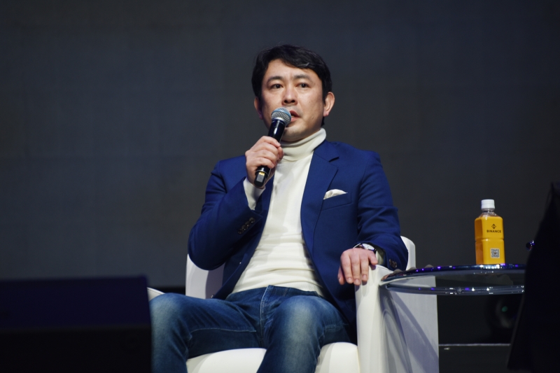 モウ氏へのインタビューは対談形式で進行する。左はモデレーターの衛藤バタラ氏