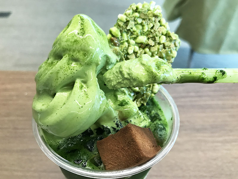 天空の抹茶の旨みはもちろん、まずドリンクで潤して、クレマジェラータ(ソフトクリーム)のなめらかさ、ライスパフのサクサク感、わらび餅のぷるぷる感と、立体的に楽しんでみて♪♪♪」