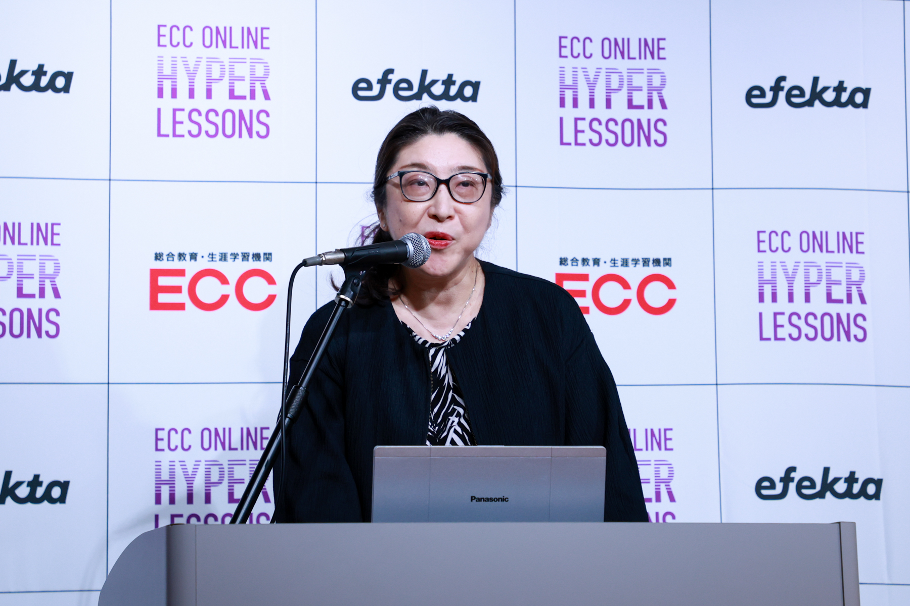 記者発表会にて、ECC 常務取締役 塚田訓子氏は、Efektaとの提携や同サービスの提供の背景について、コロナ禍でオンラインレッスンの需要が高まったが、オンラインレッスンは継続率が低く、利用者が楽しく学べるオンラインレッスンを模索していた点を挙げた。その上で、EFのユニークなオンラインレッスンを目にしたことをきっかけに提携が進んだという。