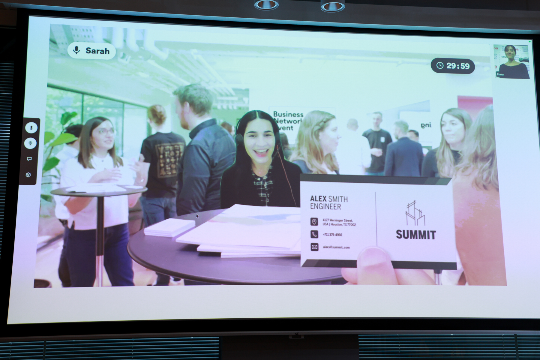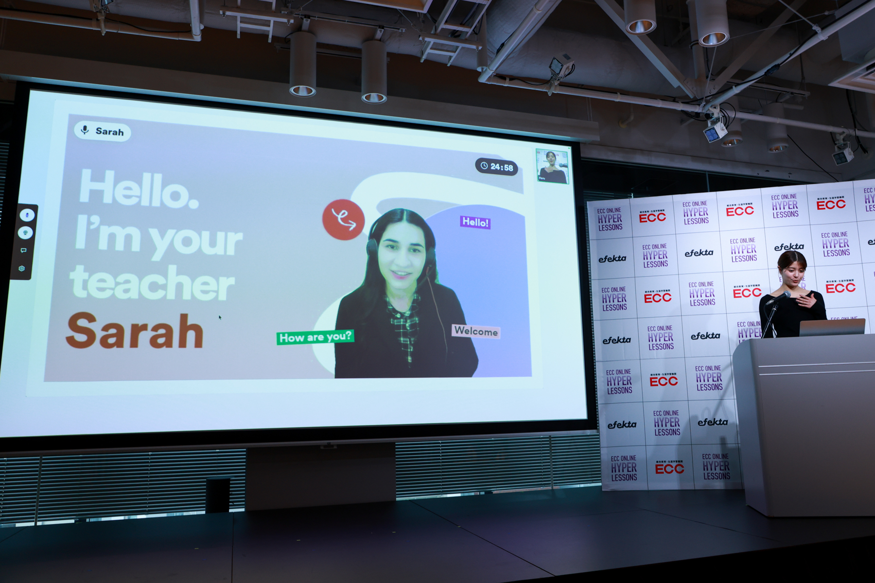 記者発表会では、レッスンデモンストレーションが行われ、受講者役のハルさんが実際にECCで講師を務めるサラさんからオンラインレッスンの一部を受けた。レッスンは簡単な挨拶から始まり、職業名などの初歩的な英語を学習。そこからさらに進み、終盤はネットワーキングイベントのシーンでの職業や職場の伝え方などを学ぶレッスンとなった。