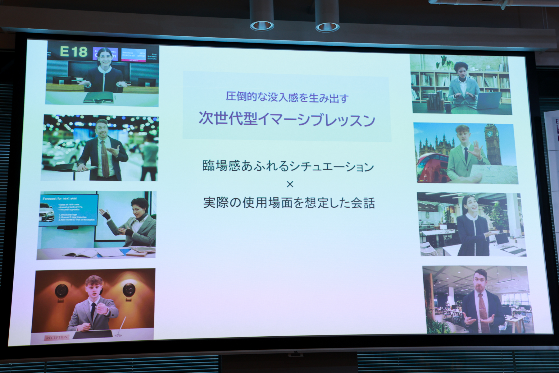 また、同サービスの特長は3つあると説明した。1つ目は「圧倒的な没入感を生み出す『次世代型イマーシブレッスン』」。単なるオンライン英会話ではなく、特定のシーンを疑似体験しながら学べる「没入型」レッスンが行われる。たとえば、講師が上司や取引先役となり、受講者は交渉やプレゼンテーションを英語で行う。講師が映る画面もシーンごとの映像に切り替わるなどの機能があるため、よりシチュエーションを想像しやすくなっている。