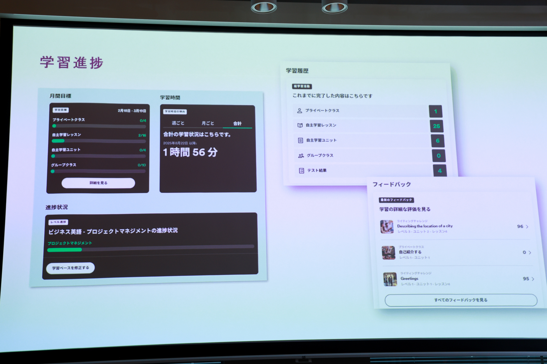 3つ目は「学習進捗の『可視化』と多角的な学習支援で学びを加速する制度」。国際基準の言語能力指標「CEFR」を採用し、A1(初心者)からC2(最上級)までをより細分化した全16段階のレベルが設定されている。また、学習時間やレッスン受講状況などの進捗に加え、講師からのフィードバックをいつでも確認できる仕組みにより、効果的に学習を進められるだけでなく、受講者のペースを整えてモチベーション維持にもつながる。