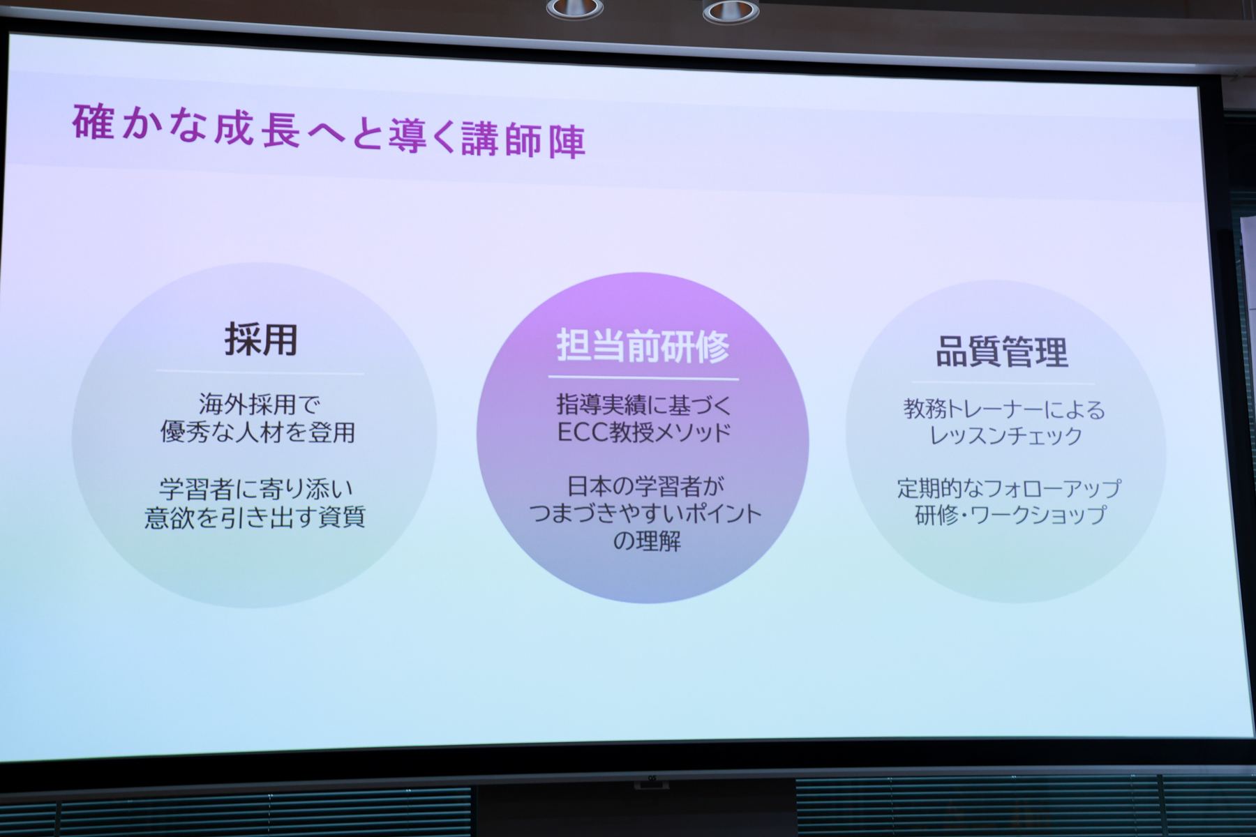 2つ目は「日本の学習者を熟知したネイティブ講師による指導」。これは同サービスの最大の特長と言える点で、ECCの講師陣は、英語圏の国々から採用され、厳しい基準をクリアしたネイティブ講師がすべてのレッスンを担当する。グローバル標準の学習基盤にECCならではの「教授力」と「伴走型の支援」が掛け合わさることで、受講者の学習を支える。