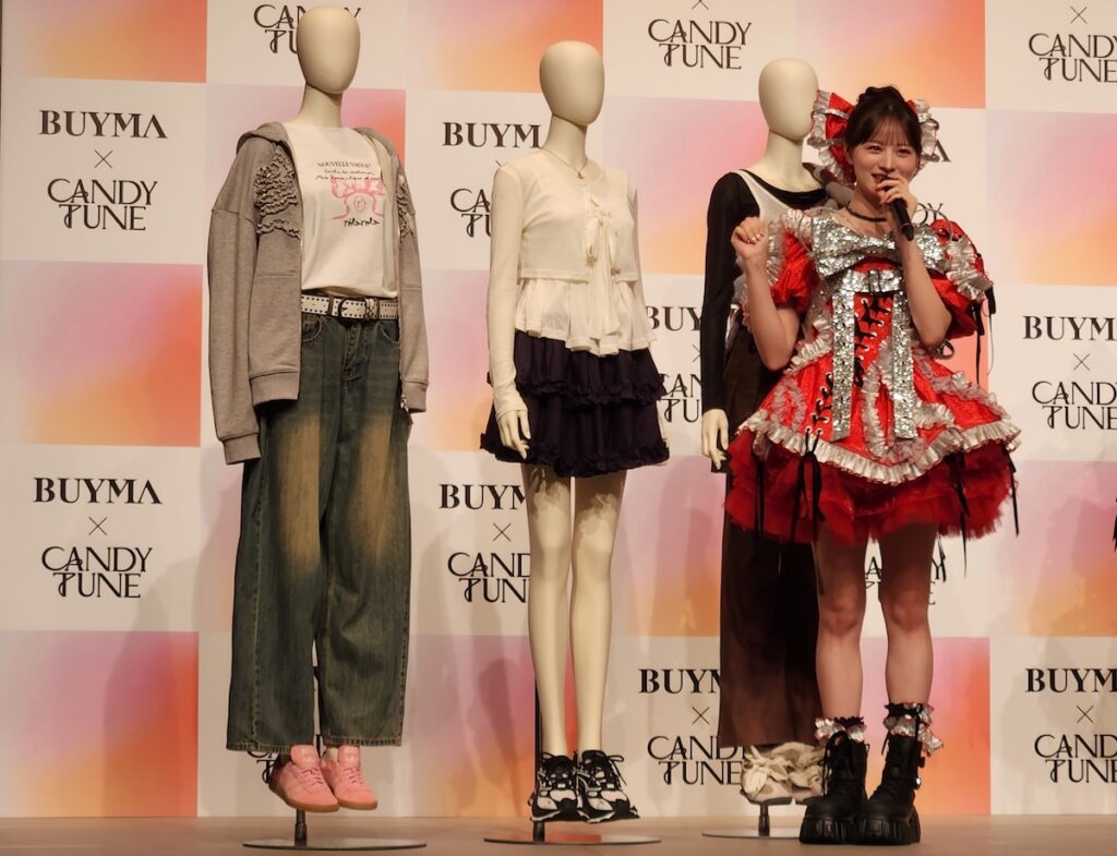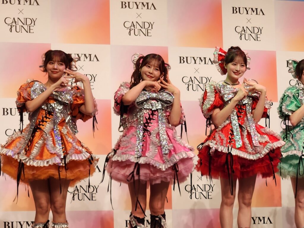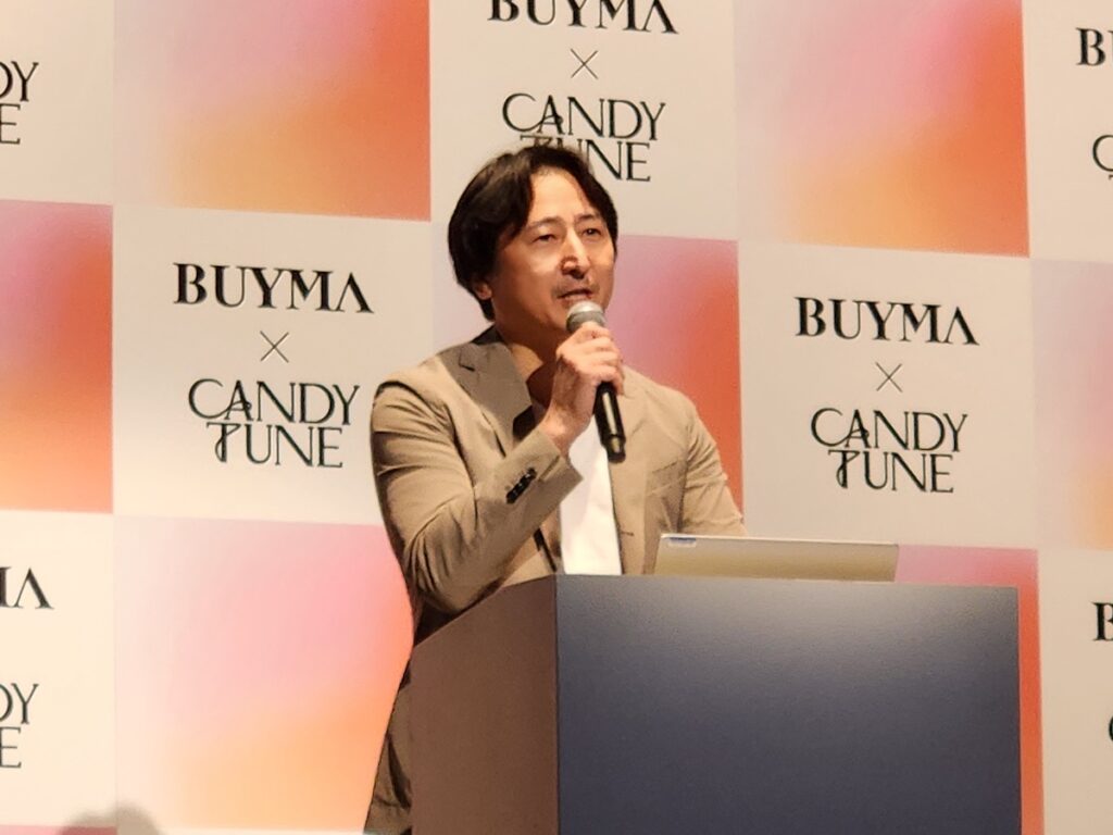 「BUYMA」を運営するエニグモについて須田さんは、「かわいい服だとか、お得なアイテムだとか、世界中の素敵な体験とか、人生を豊かにする感動の選択肢、世界中からそういった感動の選択肢を提供して、安心して届けていくというようなことをビジョンとしております」と紹介。また、「今回はそれをCANDY TUNEさんに広めてもらいたいという風に思っておりまして、実はCANDY TUNEの「倍倍FIGHT!」が大好きすぎて、歌を聴いてたら『倍の倍の♪』って曲が、『バ~イマ、バイマ♪』って聞こえてしまって、そこでばっと繋がって始まってるんですけれども」と今回の経緯を説明し、笑いを誘いました。