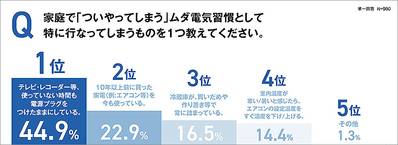 その結果、最も多かったのは「テレビやレコーダーなど、使っていない時間も電源プラグを差したままにしている」で44.9%となり、約半数が「つけっぱなし・差しっぱなし」の状態であることが明らかに。