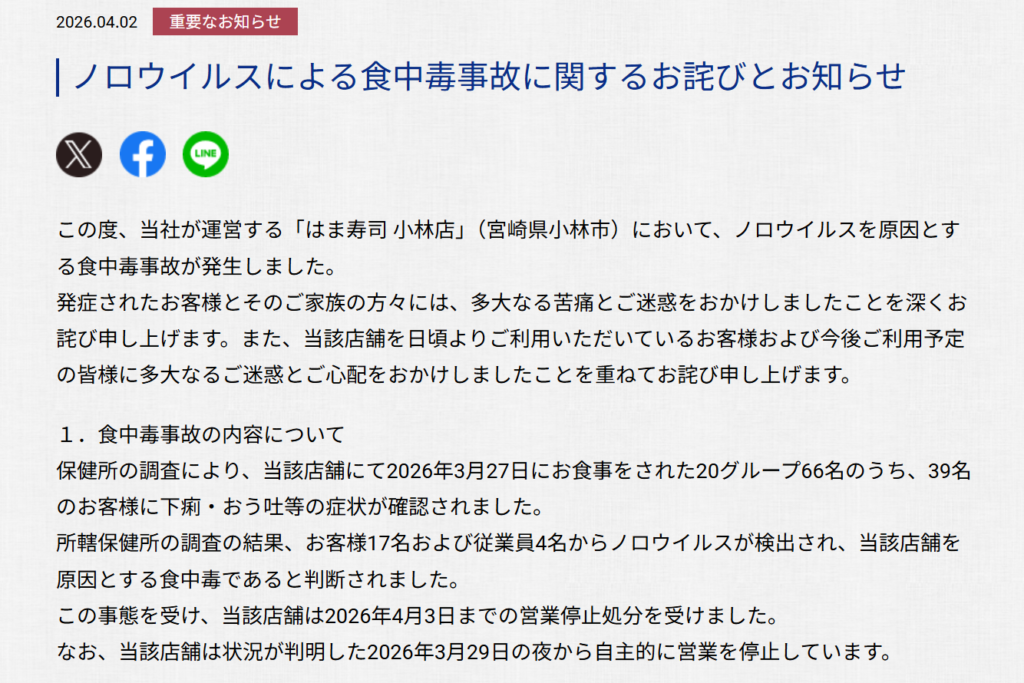 はま寿司は、ホームページで「発症されたお客様とそのご家族の方々には、多大なる苦痛とご迷惑をおかけしましたことを深くお詫び申し上げます」と謝罪した。