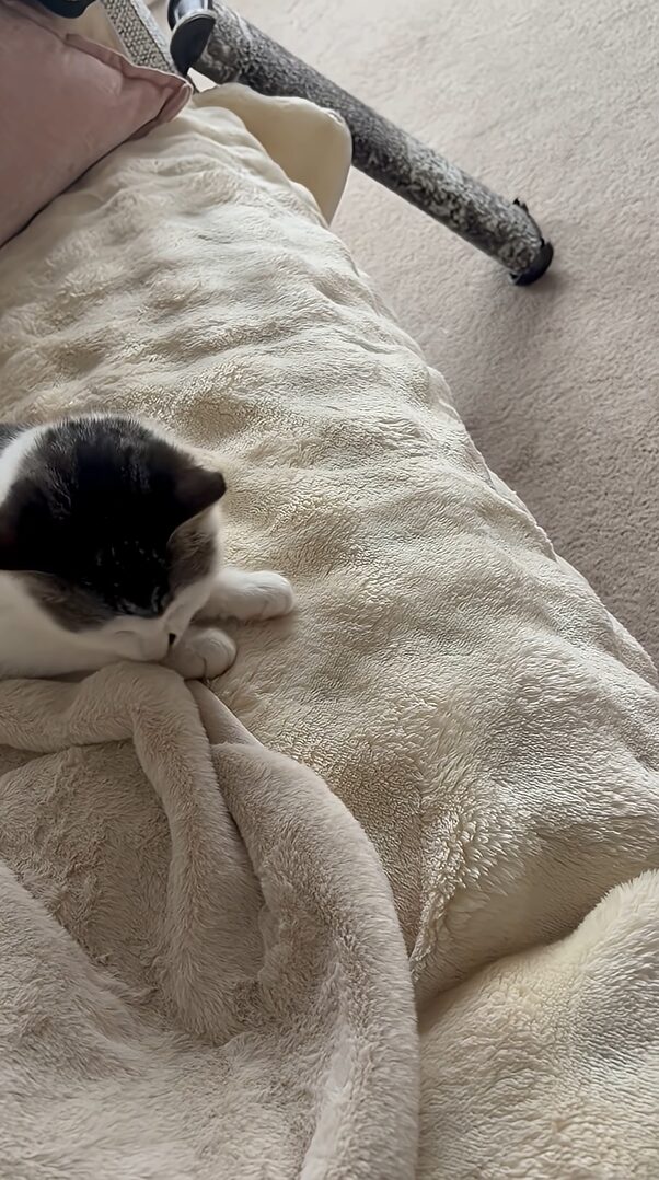 自分の体やおててではなく、なぜかソファを毛づくろいしていたネコのルーシー。