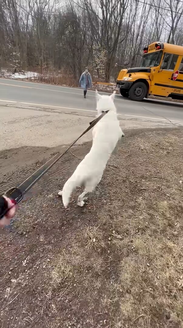そして、スクールバスから女の子が姿を現すともう今にもリードを振り切らんとばかりの勢いを見せます。
