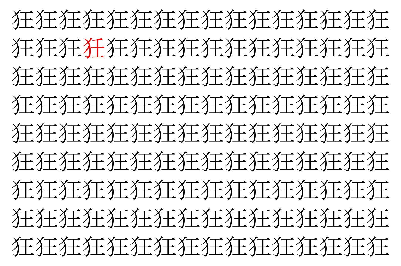 【脳トレ】「狂」の中に紛れて1つ違う文字がある!?あなたは何秒で探し出せるかな??【違う文字を探せ!】
