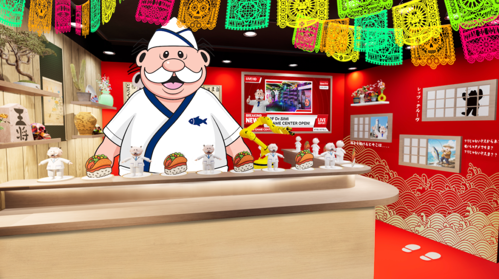 1Fは、来場者が最初に足を踏み入れる“Dr.Simiとのワクワクの出会い”のフロア。板前風に変身した『Dr.Simi』が迎えるユニークな寿司カウンターや、日本上陸のニュースを届ける「Simi TV」や、旅行ノートや思い出の写真が並ぶ「Simiの部屋」など、遊び心あふれる演出が満載です。日本×メキシコが融合したカラフルな世界観の中で、『Dr.Simi』の魅力を楽しく知ることができます。