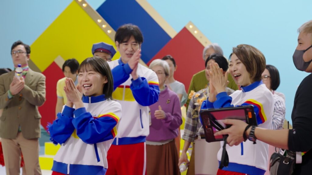 音楽に合わせて演技を行うシーンでは、タイミングや表情の微調整が求められる場面も多かったとのことですが、出演者それぞれの表現力によってスムーズに進行。特に、リズムに合わせた掛け合いは完成度が高く、CM全体の軽快さにつながっています。また、クライマックスの階段シーンでは大人数での撮影となり、動きを揃える難しさもあったようですが、全員が笑顔を絶やさずに臨んだことで、明るく印象的なシーンに仕上がったといいます。現場の空気そのものが、そのまま映像に反映されているような温かさが感じられます。