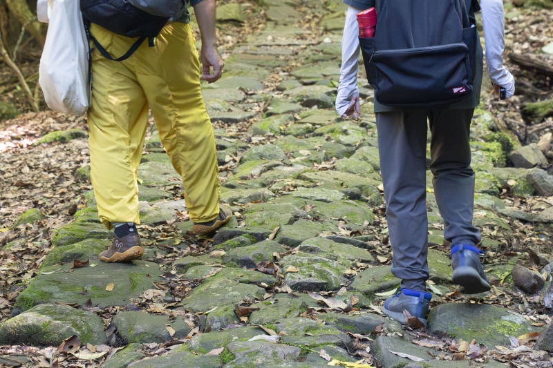 道を歩きながら紹介されるのは、目に見える風景だけではありません。石畳の形状に残る歴史の痕跡や、岩肌に刻まれた石仏、さらには動物のフンや食痕といった小さな手がかりまで、森の中にはさまざまな情報が散りばめられています。
