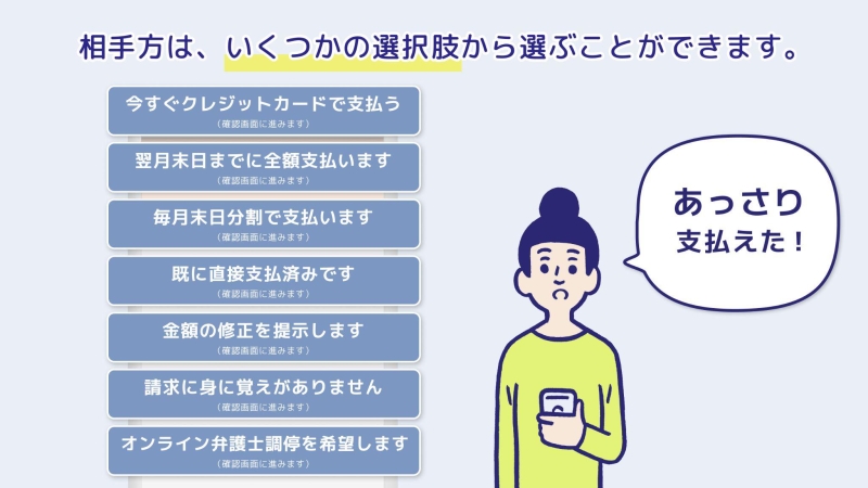その上で同社が大切にしたのは、イソップ童話『北風と太陽』になぞらえた“対話による解決”の作法です。一方的に支払いを迫る「北風」のような手法は、かえって債務者を頑なにし、対話の拒絶を招きかねません。対してワンネゴが目指すのは、自ら「上着を脱ぐ」ように支払いの必要性を自覚してもらう「太陽」のアプローチ。この思想は、システム設計の細部にまで反映されています。