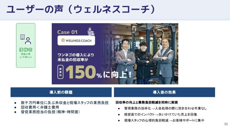 これまでの対応であれば、一度トラブルになれば関係断絶も生じましたが、ワンネゴは「合わせる顔がない」という心理的負担を与えません。解決後のリピート利用という、従来の回収業務ではあり得なかった結果を生んでいるのです。