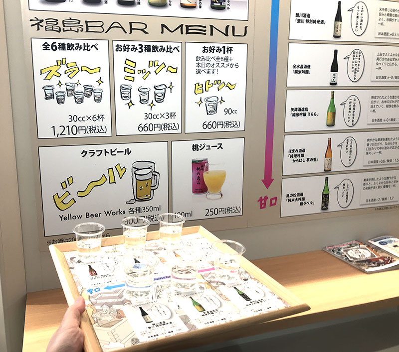 JR東京駅改札内 福島BAR『ほろ酔い、福島』(4/9~4/13 10~20時、最終日の13日は17時閉店)では、その場で福島の日本酒の飲み比べや地ビール、桃ジュースなどが楽しめる「福島BAR」が登場。