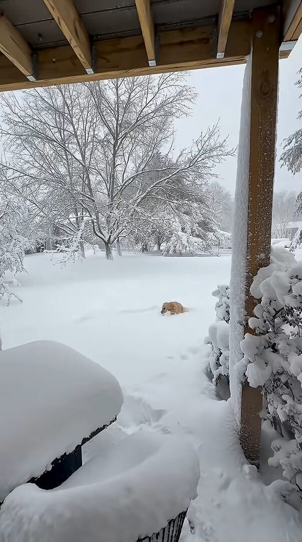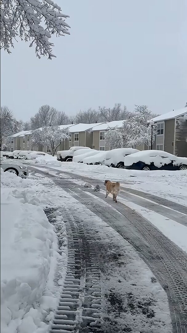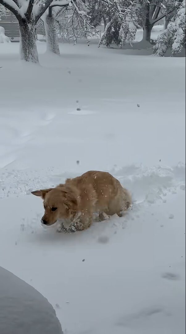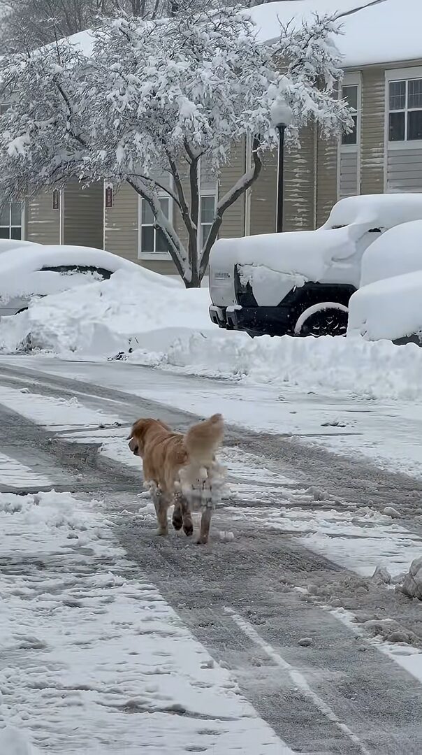 雪遊びをいっぱい楽しんだんだね~!ゴキゲンな足取りのイヌが雪玉を体にたくさんつけている!!【アメリカ・動画】