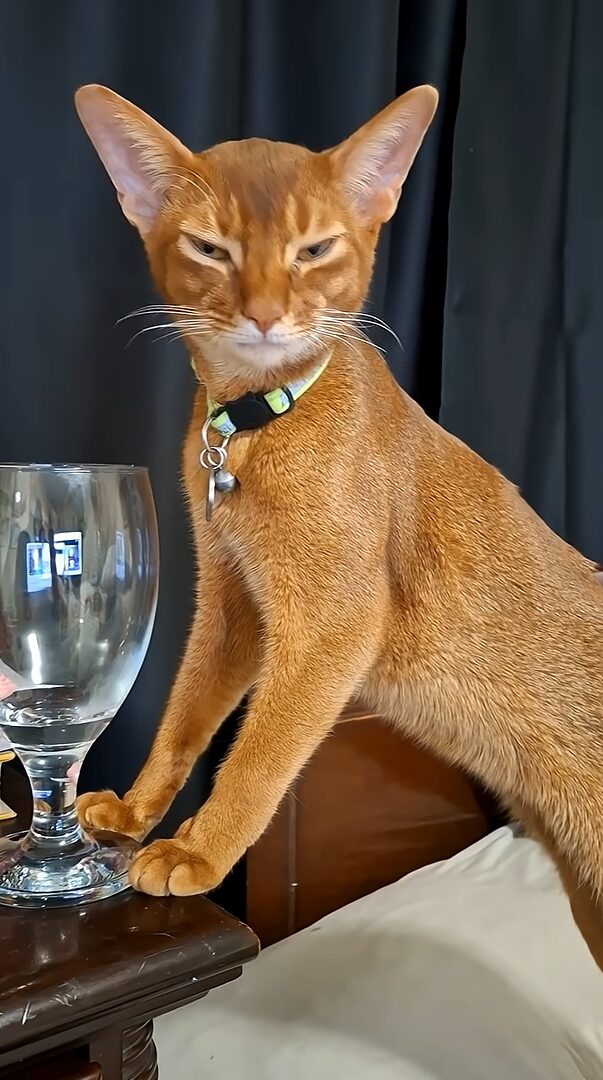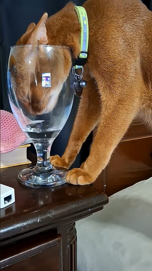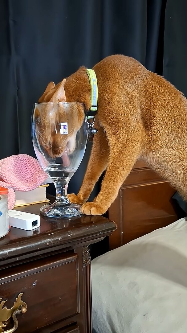 ドレッサーの上に置かれたグラスに、ネコがこ頭を突っ込んでいます。