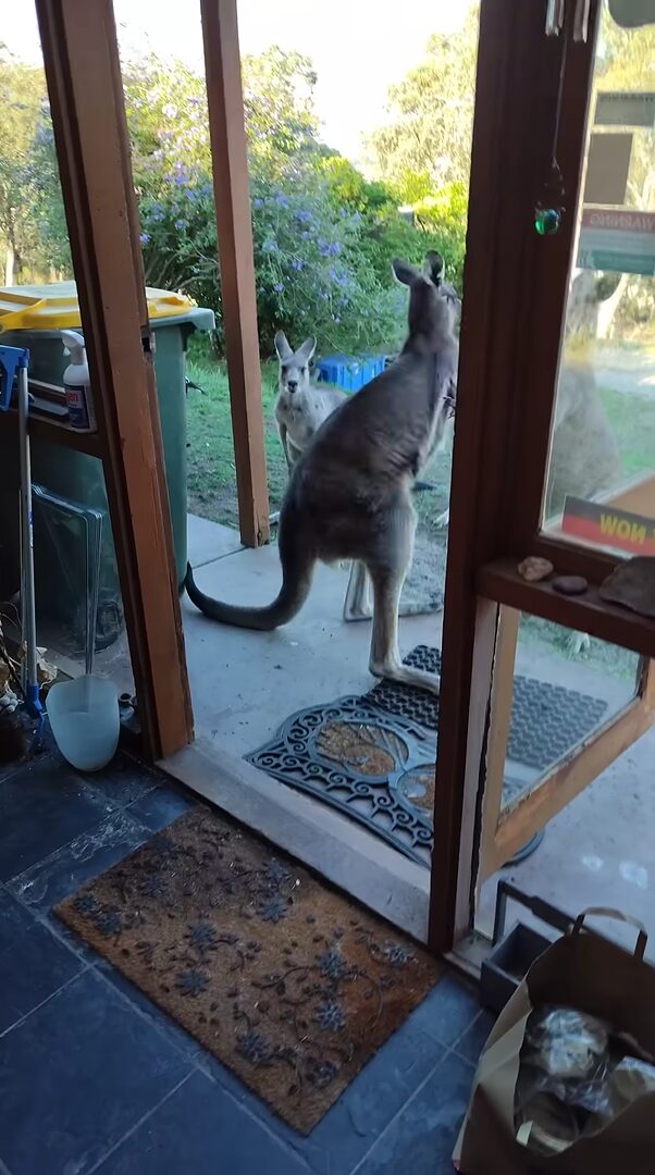 長年顔見知りのお客さん。やって来たのは家族を連れた野生のカンガルー!?【海外・動画】
