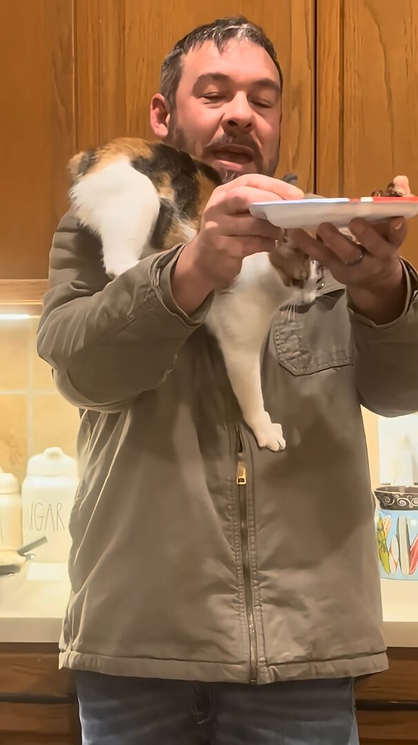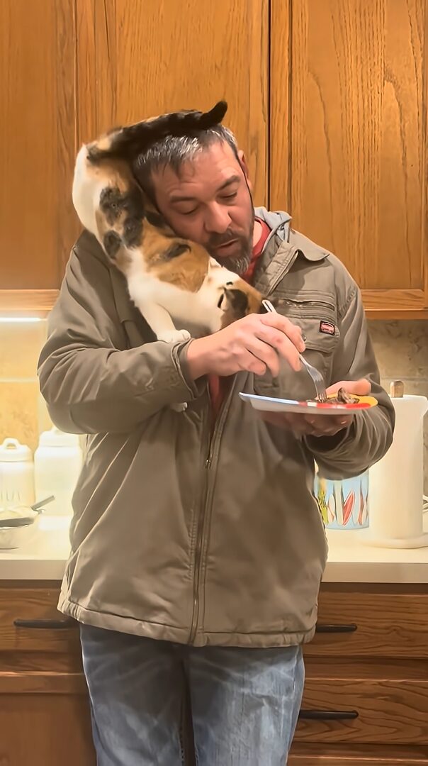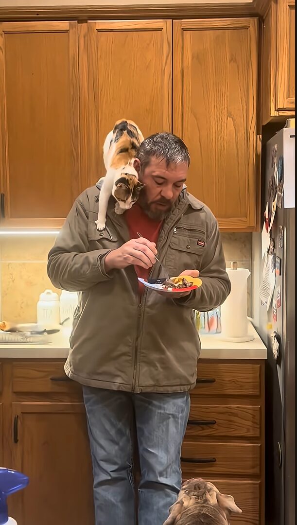 そんな旦那さんの肩には、ネコの姿もあります。