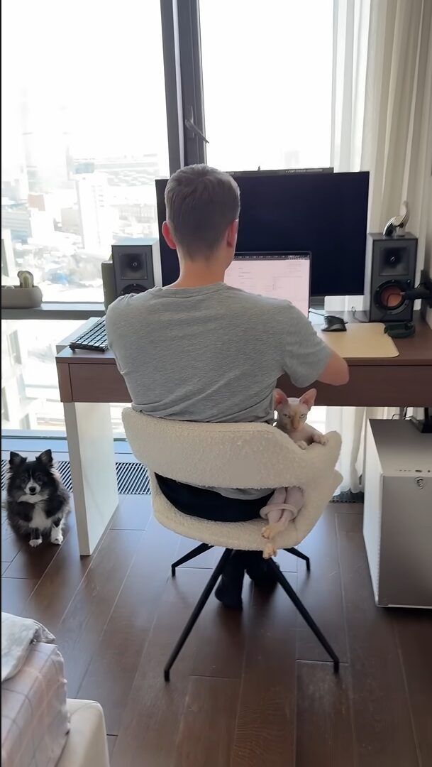 窓際のデスクで仕事に勤しむ旦那さんでしたが・・・、そこには「隣は譲らニャい!」とばかりに陣取る愛猫の姿がありました!!
