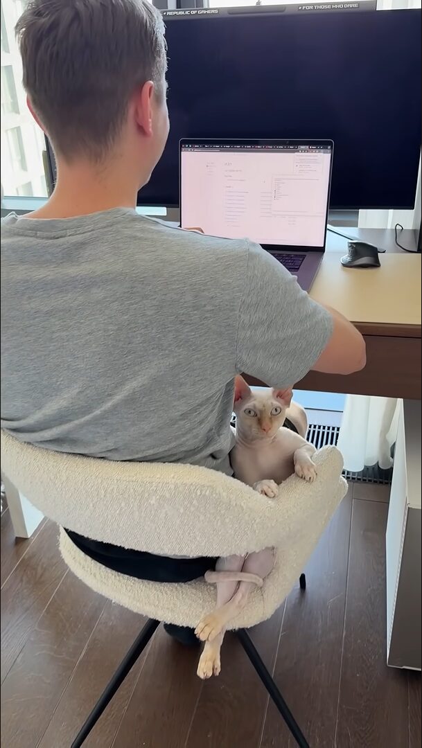 パパさんが仕事中でも隣は譲らニャい!イスのわずかなスペースを陣取るネコ【海外・動画】